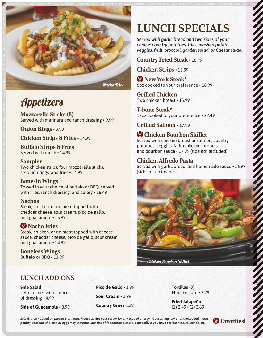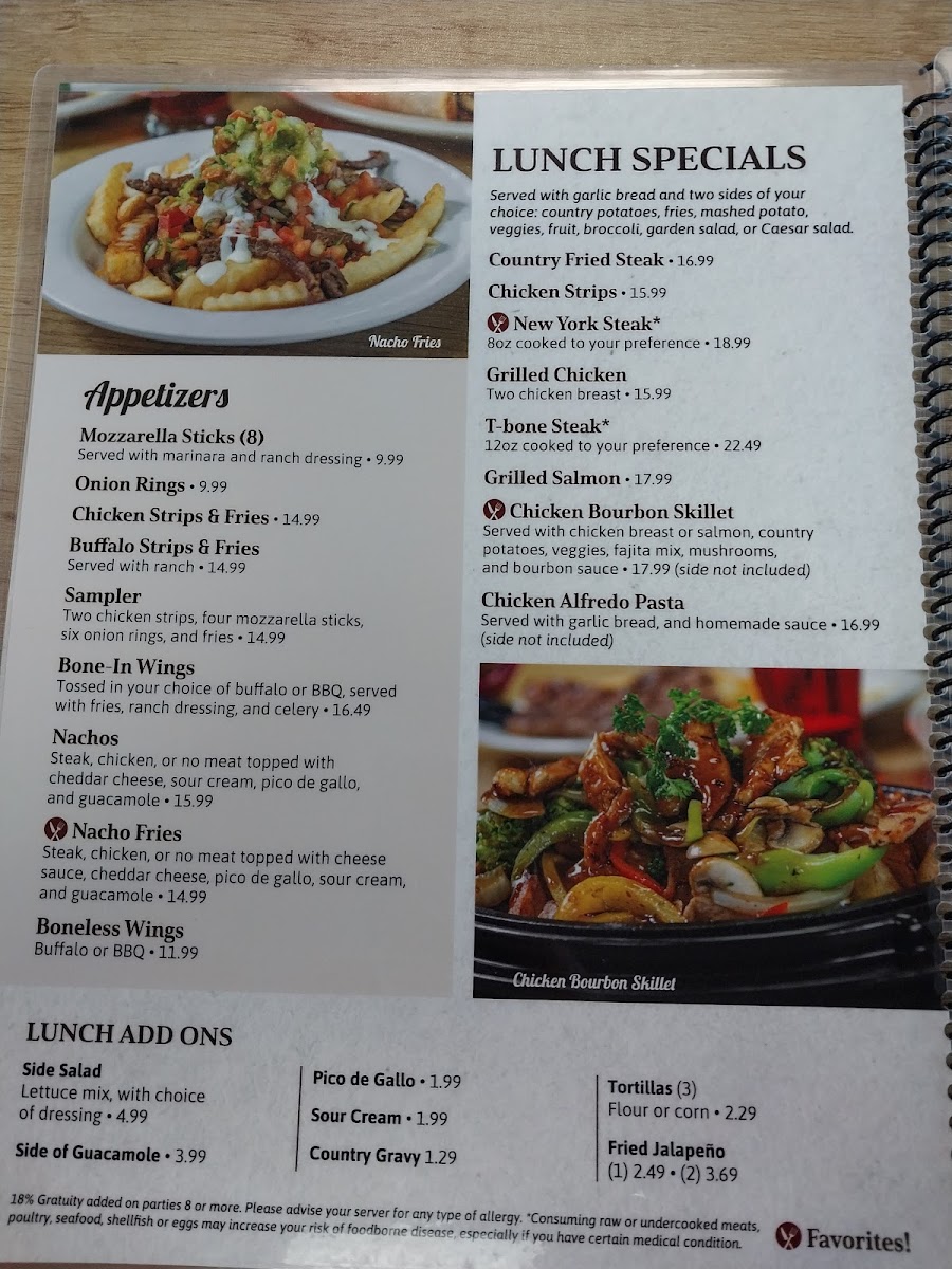 Chicken breast, country potatoes, mushrooms, broccoli, and fajita mix topped with bourbon sauce.